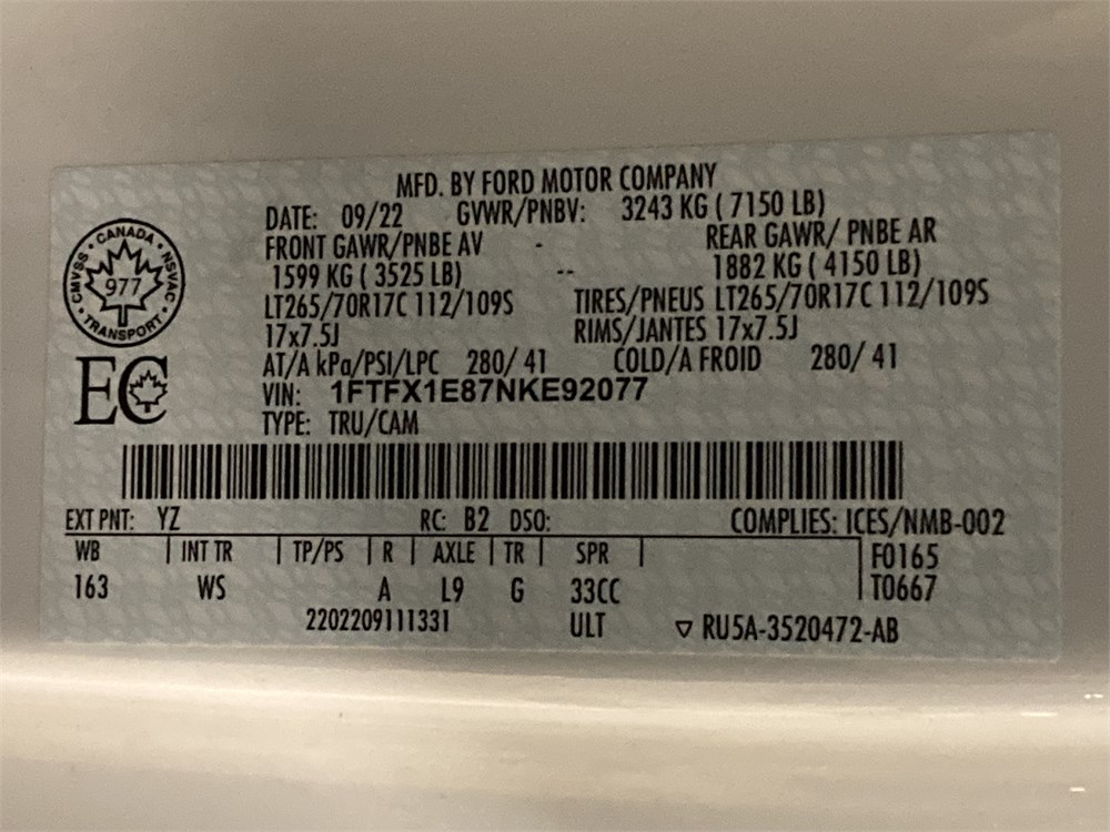 2022_FORD_F-150 XL _ CAMIONNETTE  4 X 4    ,Odomètre:251 283  km,Essence,Automatique,No série:1FTFX1E87NKE92077,Masse (en kg):2206,Origine:Centre Gestion Equipement RoulantCGER-22-7375,»» RÉPARATIONS  MAJEURES  À  FAIRE «« à la transmission, ,Véhicule remisé le  2026-03-30  ,TVQ calculable sur:33000