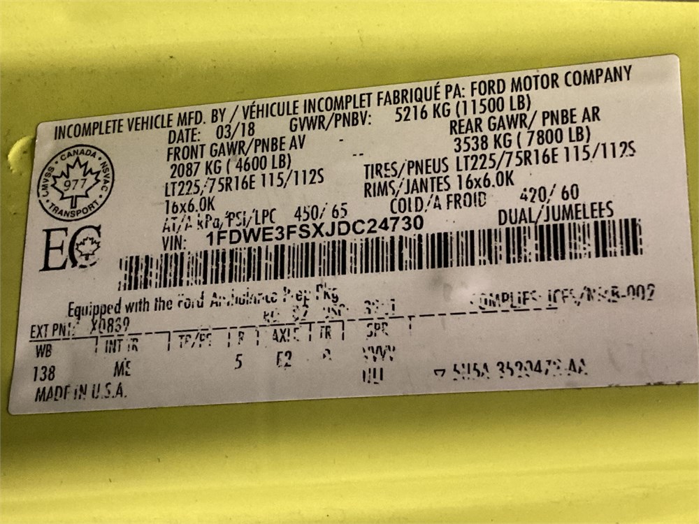 2018_FORD_E-350 _ AMBULANCE    6 ROUES, PNBV:5216KG  ,Odomètre:266 437  km,Essence,Automatique,No série:1FDWE3FSXJDC24730,Masse (en kg):4102,Origine:Corporation d'Urgences-Santé US-0071,»» RÉPARATIONS  MAJEURES  À  FAIRE «« TÉMOIN MOTEUR ALLUMÉ,Rancart, vérification méc. Obligatoire  Contrôle de vérification mécanique (CVM) requis :  ,TVQ calculable sur:Prix de vente