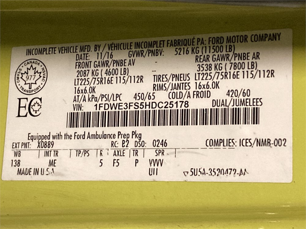 2017_FORD_E-350 _ AMBULANCE    6 ROUES, PNBV:5216KG  ,Odomètre:251 250  km,Essence,Automatique,No série:1FDWE3FS5HDC25178,Masse (en kg):4108,Origine:Corporation d'Urgences-Santé US-0157,»» AUCUNE  INFORMATION  SUR l'ÉTAT DU VÉHICULE «« ,Rancart, vérification méc. Obligatoire  Contrôle de vérification mécanique (CVM) requis :  ,TVQ calculable sur:Prix de vente
