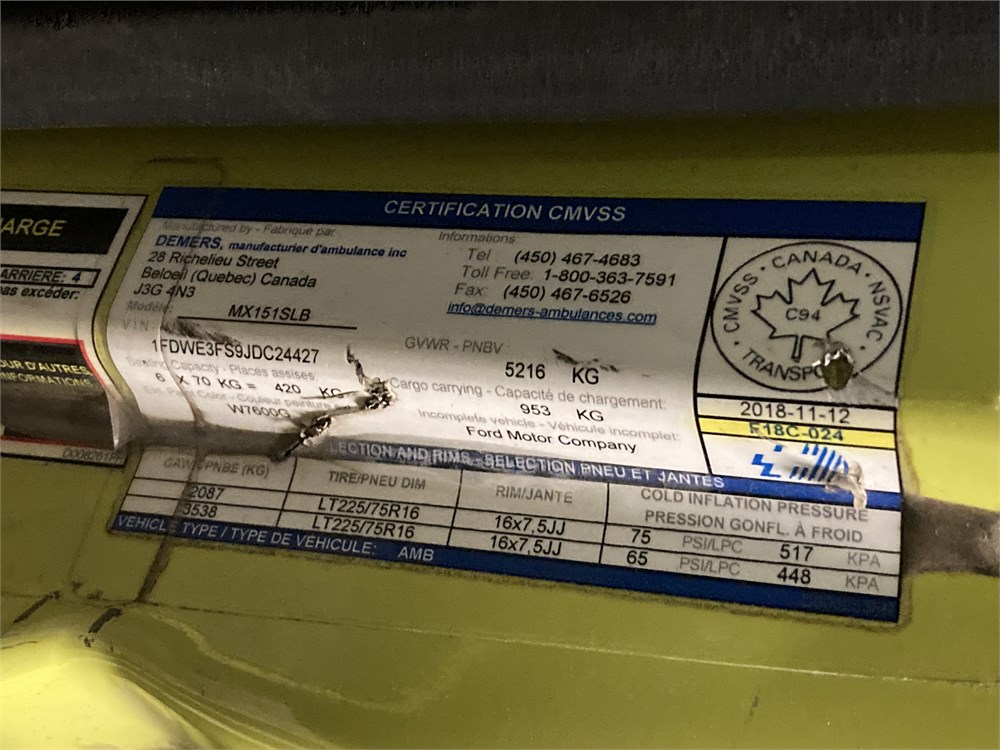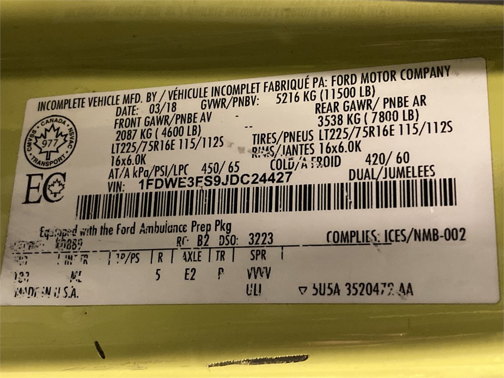 2018_FORD_E-350 _ AMBULANCE    6 ROUES, PNBV:5216KG  ,Odomètre:261 490  km,Essence,Automatique,No série:1FDWE3FS9JDC24427,Masse (en kg):4263,Origine:Corporation d'Urgences-Santé US-0223,»» AUCUNE  INFORMATION  SUR l'ÉTAT DU VÉHICULE «« ,Rancart, vérification méc. Obligatoire  Contrôle de vérification mécanique (CVM) requis :  ,TVQ calculable sur:Prix de vente