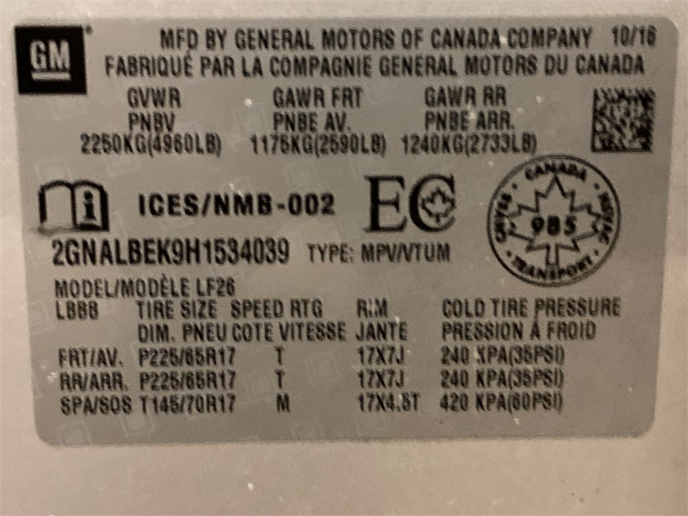 2017_CHEVROLET_EQUINOX _ VUS      ,Odomètre:159 799  km,Essence,Automatique,No série:2GNALBEK9H1534039,Masse (en kg):1673,Origine:Ville de Montréal (Matériel roulant)V MTL-164 170 412,»» AUCUNE  INFORMATION  SUR l'ÉTAT DU VÉHICULE «« ,Véhicule remisé le  2026-01-28  ,TVQ calculable sur:7400