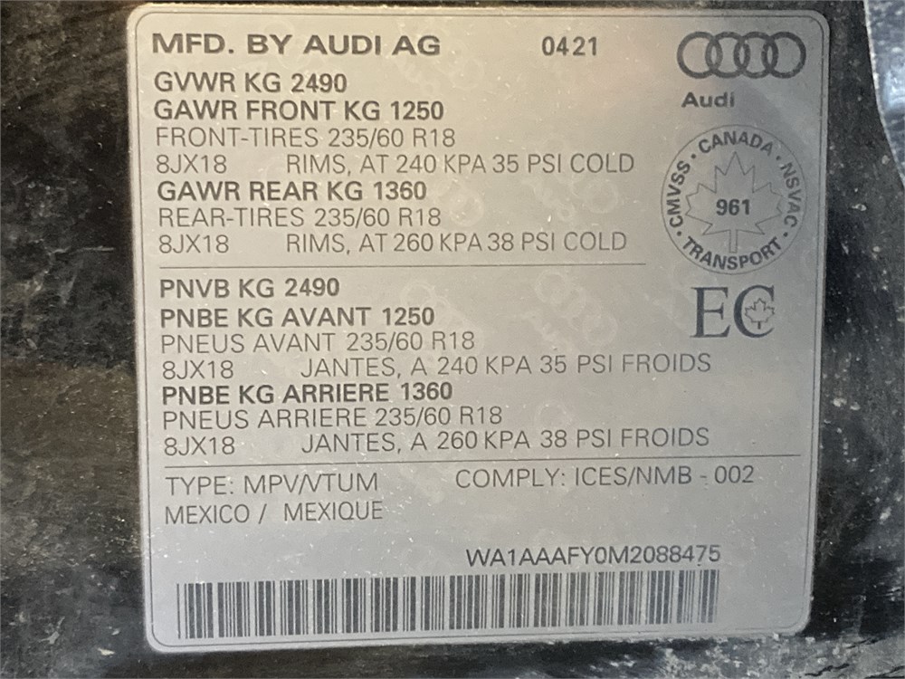 2021_AUDI_Q5 _ VUS  AWD  4 PNEUS  ,Odomètre:75 536  km,Essence,Automatique,No série:WA1AAAFY0M2088475,Masse (en kg):1798,Origine:N/DN/D-,»» AUCUNE  INFORMATION  SUR l'ÉTAT DU VÉHICULE «« ,Rancart, vérification méc. Obligatoire    ,TVQ calculable sur:21600
