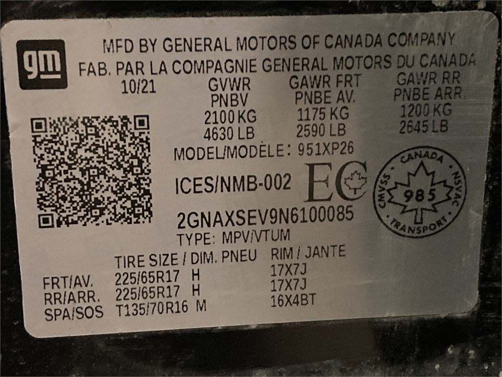 2022_CHEVROLET_EQUINOX _ VUS  AWD    ,Odomètre:60 237  km,Essence,Automatique,No série:2GNAXSEV9N6100085,Masse (en kg):1550,Origine:N/DN/D-,»» AUCUNE  INFORMATION  SUR l'ÉTAT DU VÉHICULE «« ,Rancart, vérification méc. Obligatoire    ,TVQ calculable sur:20100