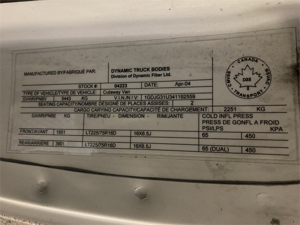 2004_GMC_SAVANA 3500 _ CAMION-CUBE    6 ROUES,M.-CHARGE,PNBV:5443KG  ,Odomètre:93 922  km,Essence,Automatique,No série:1GDJG31U341192559,Masse (en kg):3300,Origine:Société de Transport de Montréal STM-87-046,»» RÉPARATIONS  MAJEURES  À  FAIRE «« BAS DE CAISSE, PLANCHER, PHARE AV.DROIT,Vérification mécanique obligatoire  Contrôle de vérification mécanique (CVM) requis :  2025-03-01,TVQ calculable sur:Prix de vente