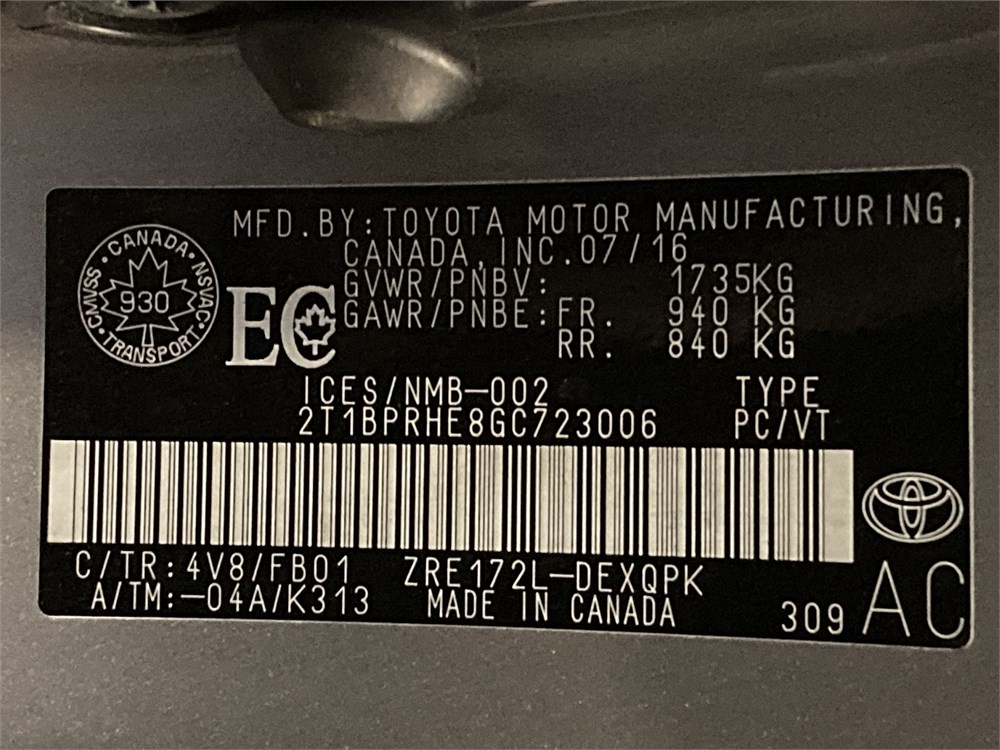 2016_TOYOTA_COROLLA LE _ AUTOMOBILE      ,Odomètre:57 958  km,Essence,Automatique,No série:2T1BPRHE8GC723006,Masse (en kg):1290,Origine:Ville de Montréal (Matériel roulant)V MTL-144 160 336,»» AUCUNE  INFORMATION  SUR l'ÉTAT DU VÉHICULE «« ,Véhicule remisé le  2026-02-16  ,Valeur HEBDOMAG:9400