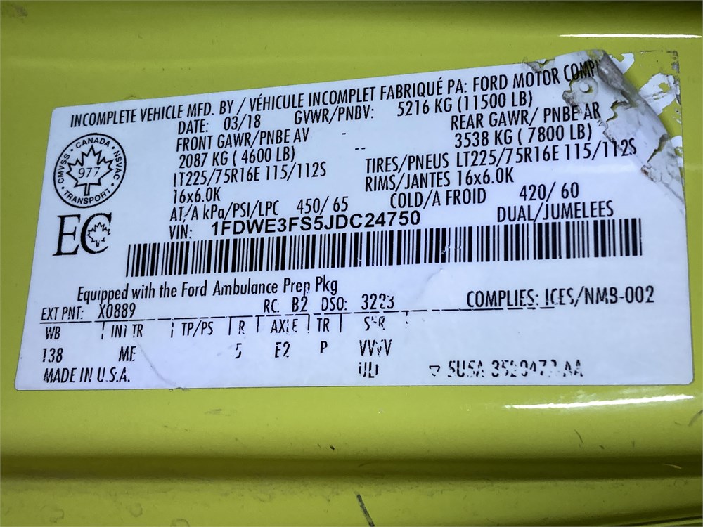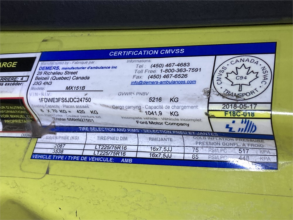 2018_FORD_E-350 _ AMBULANCE    6 ROUES, PNBV:5216KG  ,Odomètre:241 549  km,Essence,Automatique,No série:1FDWE3FS5JDC24750,Masse (en kg):4174,Origine:Corporation d'Urgences-Santé US-0081,»» RÉPARATIONS  MAJEURES  À  FAIRE «« au moteur, ,Rancart, vérification méc. Obligatoire  Contrôle de vérification mécanique (CVM) requis :  ,TVQ calculable sur:Prix de vente