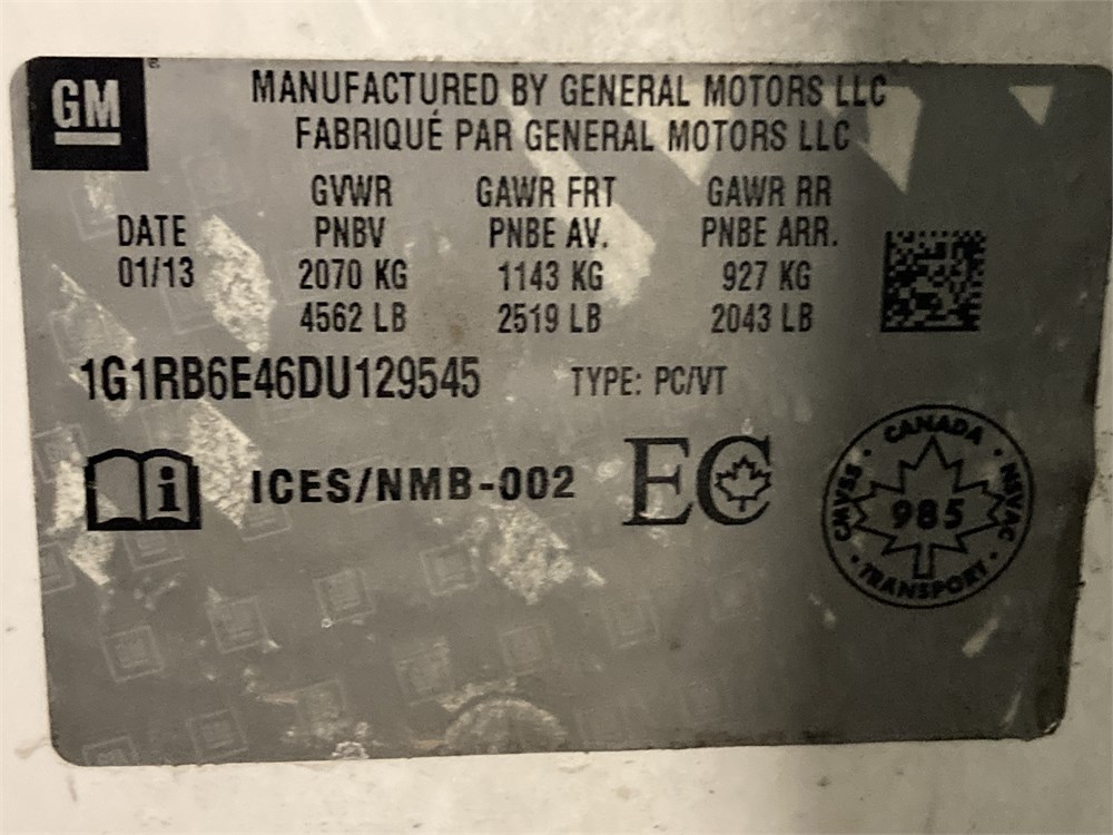 2013_CHEVROLET_VOLT _ AUTOMOBILE    HYBRIDE  ,Odomètre:105 684  km,Hybride,Automatique,No série:1G1RB6E46DU129545,Masse (en kg):1694,Origine:Centre Gestion Equipement Roulant CGER-13-0146,»» RÉPARATIONS  MAJEURES  À  FAIRE «« au moteur, à la transmission, SYST.ÉLECTRIQUE,Véhicule remisé le  2026-03-30  ,Valeur HEBDOMAG:4800