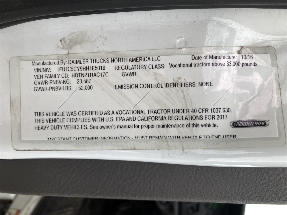 2017_FREIGHLINER_M2 _ CAMION TRACTEUR    10 ROUES, PNBV:23587KG  ,Odomètre:471 361  km,Diesel,Automatique,No série:1FUJC5CY9HHJE5016,Masse (en kg):6635,Origine:Centre Gestion Equipement Roulant CGER-17-31052,»» RÉPARATIONS  MAJEURES  À  FAIRE «« MOTEUR A REMPLACER, PAS D'HUILE,Vérification mécanique obligatoire  Contrôle de vérification mécanique (CVM) requis