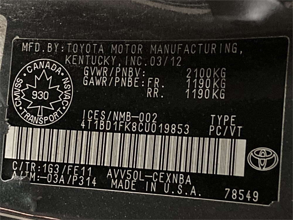 2012_TOYOTA_CAMRY LE _ AUTOMOBILE    HYBRIDE  ,Odomètre:219 885  km,Hybride,Automatique,No série:4T1BD1FK8CU019853,Masse (en kg):1,Origine:SAAQ-Division Gestions des Sanctions SAAQ-DGS-43707772,»» AUCUNE  INFORMATION  SUR l'ÉTAT DU VÉHICULE «« ,Vérification mécanique obligatoire    ,TVQ calculable sur:5900