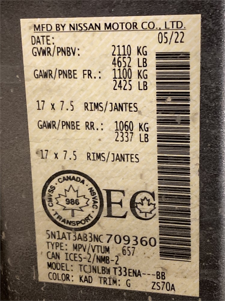 2022_NISSAN_ROGUE _ VUS  AWD    ,Odomètre:121 395  km,Essence,Automatique,No série:5N1AT3AB3NC709360,Masse (en kg):1,Origine:SAAQ-Division Gestions des Sanctions SAAQ-DGS-41672303,»» AUCUNE  INFORMATION  SUR l'ÉTAT DU VÉHICULE «« ,Vérification mécanique obligatoire    ,Valeur HEBDOMAG:19200