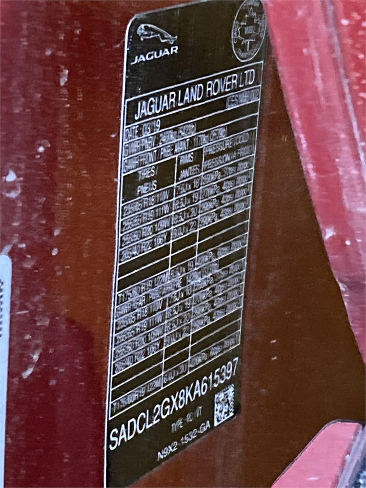 2019_JAGUAR_F-PACE 25T R-SPORT _ VUS  AWD    ,Odomètre:46 344  km,Essence,Automatique,No série:SADCL2GX8KA615397,Masse (en kg):1,Origine:SAAQ-Division Gestions des Sanctions SAAQ-DGS-44825426,»» AUCUNE  INFORMATION  SUR l'ÉTAT DU VÉHICULE «« ,Vérification mécanique obligatoire    ,Valeur HEBDOMAG:21000