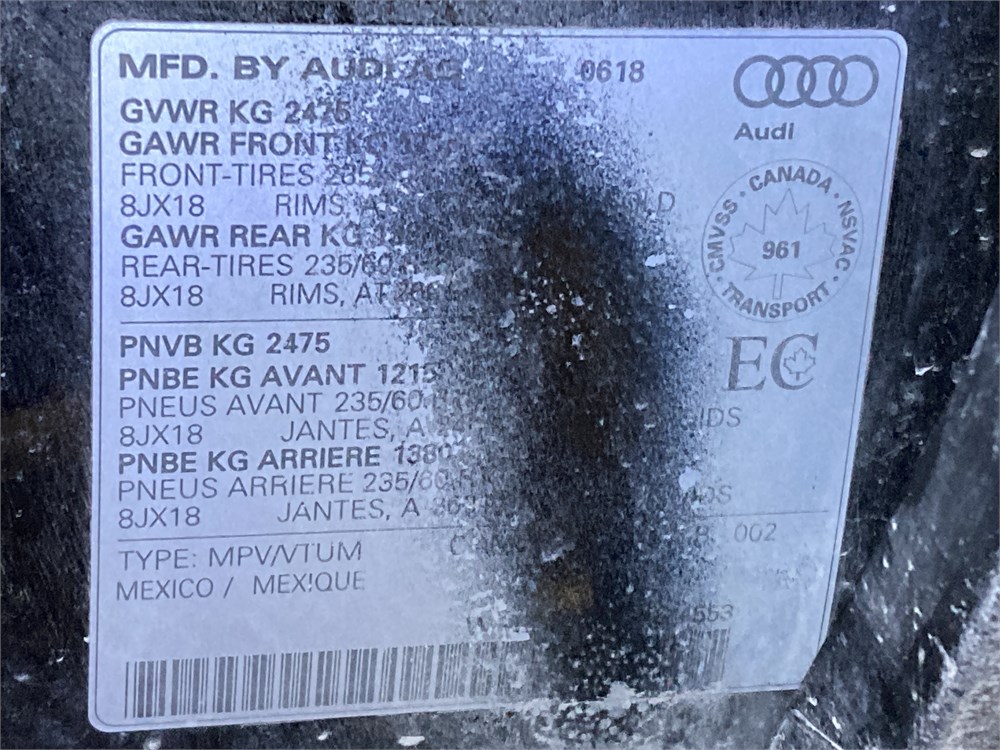 2018_AUDI_Q5 _ VUS  AWD    ,Odomètre:156 362  km,Essence,Automatique,No série:WA1ANAFY6J2204553,Masse (en kg):1,Origine:SAAQ-Division Gestions des SanctionsSAAQ-DGS-44838342,»» AUCUNE  INFORMATION  SUR l'ÉTAT DU VÉHICULE «« ,Vérification mécanique obligatoire    ,TVQ calculable sur:14100